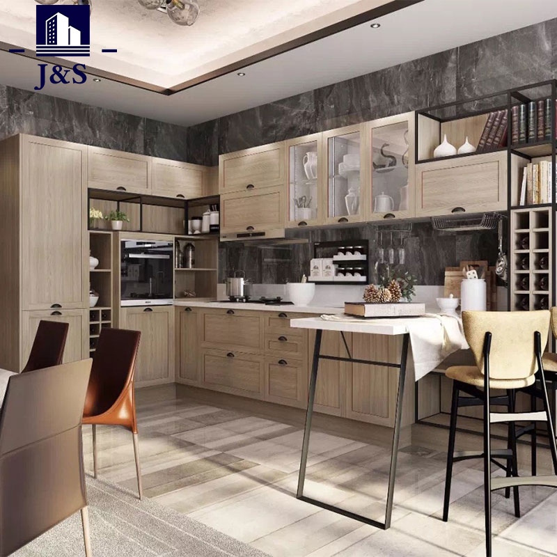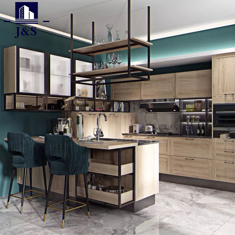 J&S HOUSEHOLD er et selskap dedikert til å gi kunder tilpassede løsninger for hele hjemmet deres. Vi tilbyr design og transformasjon av åpent luksuskjøkken. Dette settet har et åpent kjøkkendesign, som er integrert med veggskapdører i herdet glass, matoppbevaring i trefiner og en base i brunmalt øy. De lyse glasshyllene med LED gjør skapet varmere og mer blendende, og skaper en luksuriøs og eksklusiv tekstur.