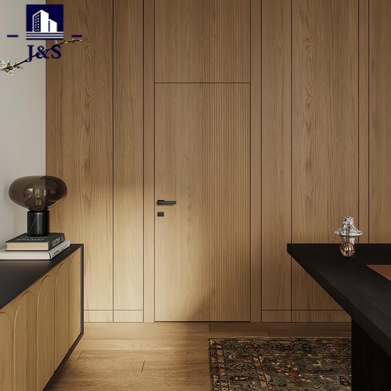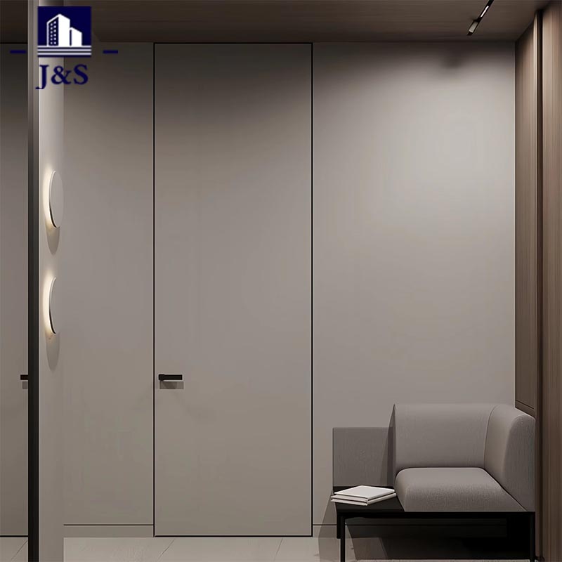 Disse innvendige, skjulte soveromsdørene legemliggjør essensen av spesialdesignet hele huset, perfekt i tråd med unge menneskers foretrukne moderne estetikk. Dørene er sømløst integrert i veggen og eliminerer tradisjonelle dørkarmer og klumpete kanter, og skaper en ren, ubrutt visuell flyt som visker ut linjen mellom dør og vegg. De glatte, nøytraltonede overflatene og de elegante metallhåndtakene kompletterer de omkringliggende minimalistiske møblene og den myke omgivelsesbelysningen, og gjenspeiler en rolig, sofistikert livsstil. Denne designen prioriterer romlig sammenheng og diskré eleganse, noe som gjør den til et toppvalg for unge huseiere som verdsetter enkelhet, funksjonalitet og et sammenhengende, rotfritt bomiljø. Den forvandler vanlige døråpninger til subtile, stilige elementer som forsterker den generelle følelsen av rom og modernitet.