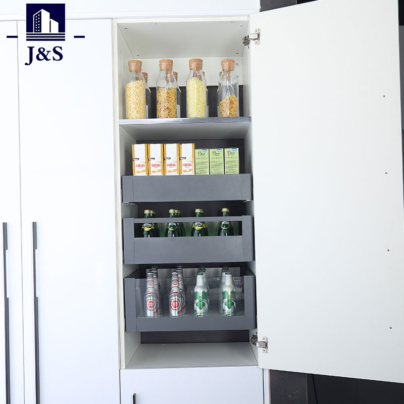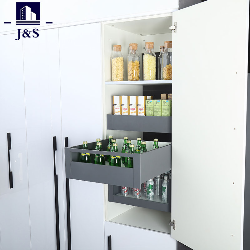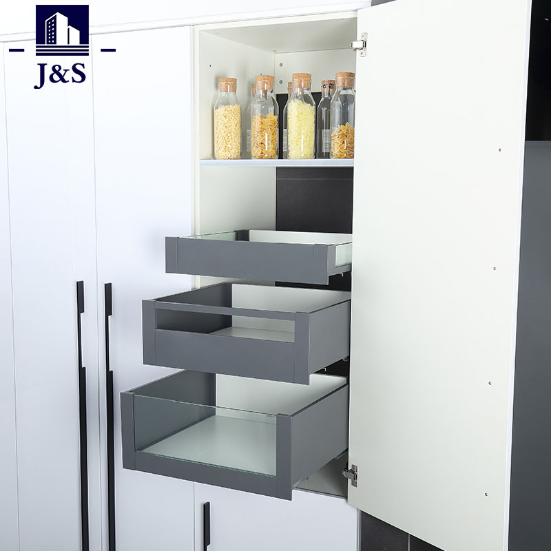 Kjøkkeninnsats Slow Motion Drawer Soft Close Slides Tandem Box er en tre-lags stålsideplate med innebygd demping, også kjent som luksusdemping. Det er det beste maskinvaretilbehøret som brukes på hele kjøkkenet, garderoben, skuffen, etc. det er mer solid og slitesterk enn den tredelte styreskinnen.