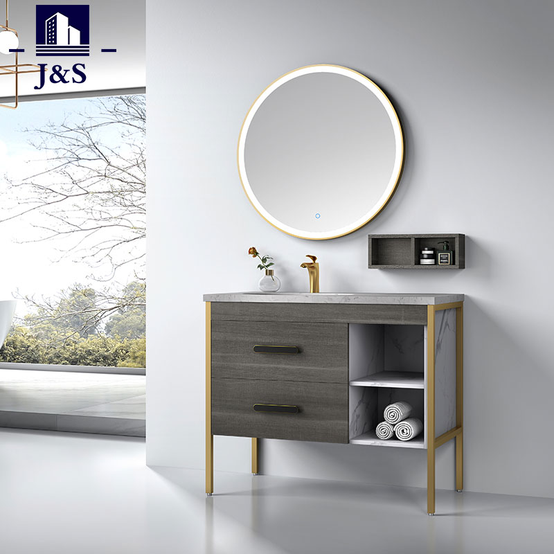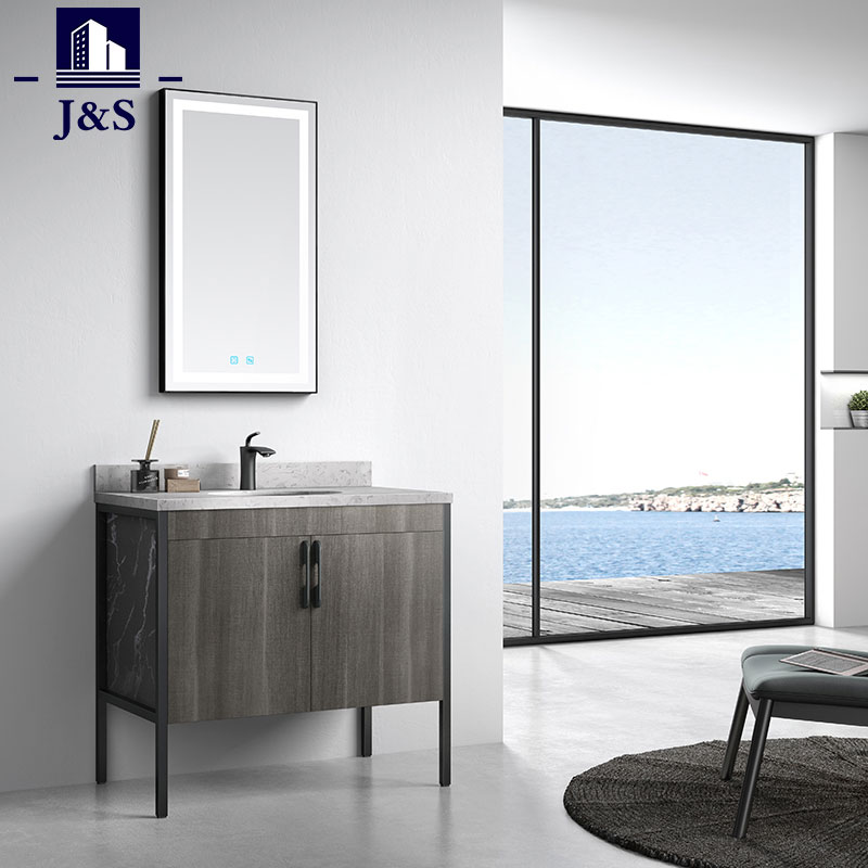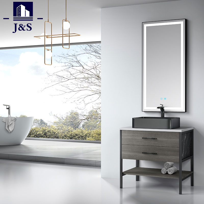 J&S leverer et moderne rustikk baderomsskapsett hjørne. Utformingen av denne baderomsservanten kombinert med aluminiumsramme, skapkropp av kryssfiner, skuffløper i tandemboks, kvartstopp vil være det slitesterke og sterkere materialet for forfengelighet. Speiloppheng oppfyller kundenes behov.