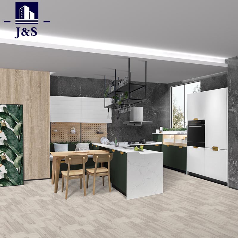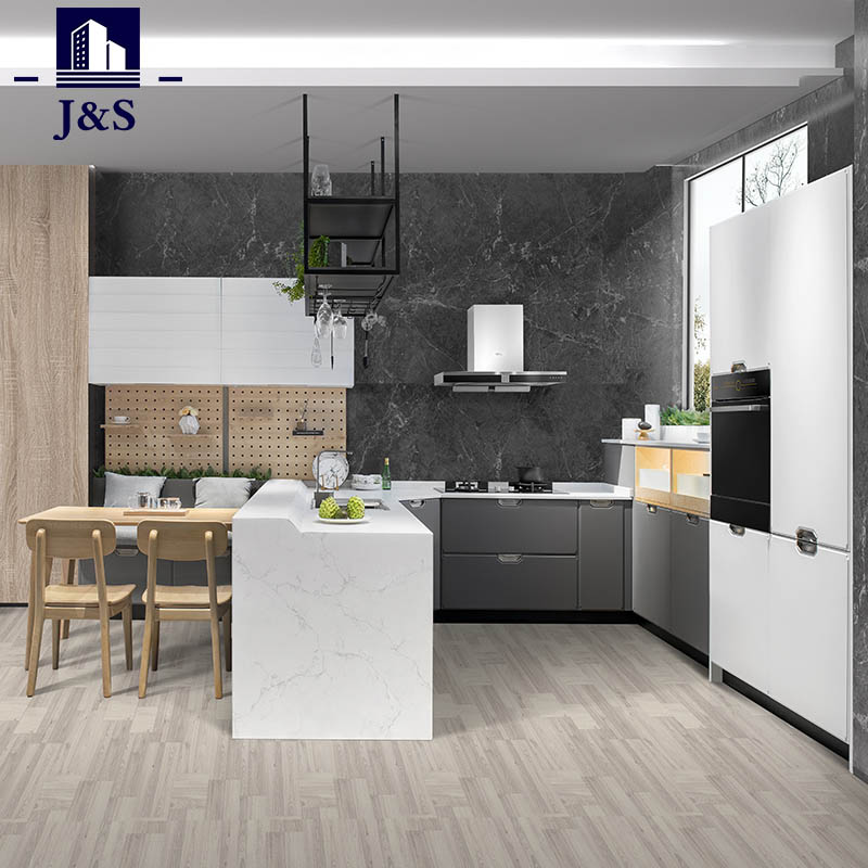J&S leverer Nytt design matt hvitt kjøkkenskap, det er akrylbehandlet dørkjøkkenskap. Akryldørpaneler brukes for god gjennomsiktighet, fordi denne typen dørpaneler er laget av fargeløse og gjennomsiktige plexiglassplater, og lystransmittansen kan nå mer enn 92 %, oppnå en speileffekt og visuelt utvide kjøkkenplassen.