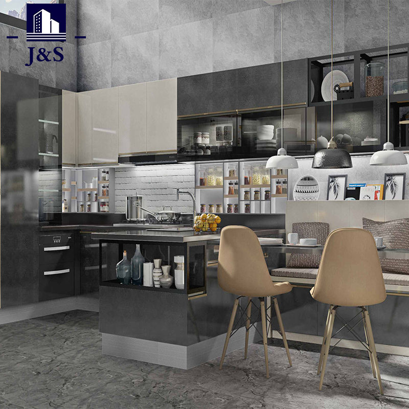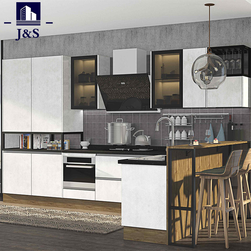 J&S leverer Kampanje Luksus landkjøkken design beste pris .PET betong farge kjøkkendør, rustfritt stål slitesterk benk topp.